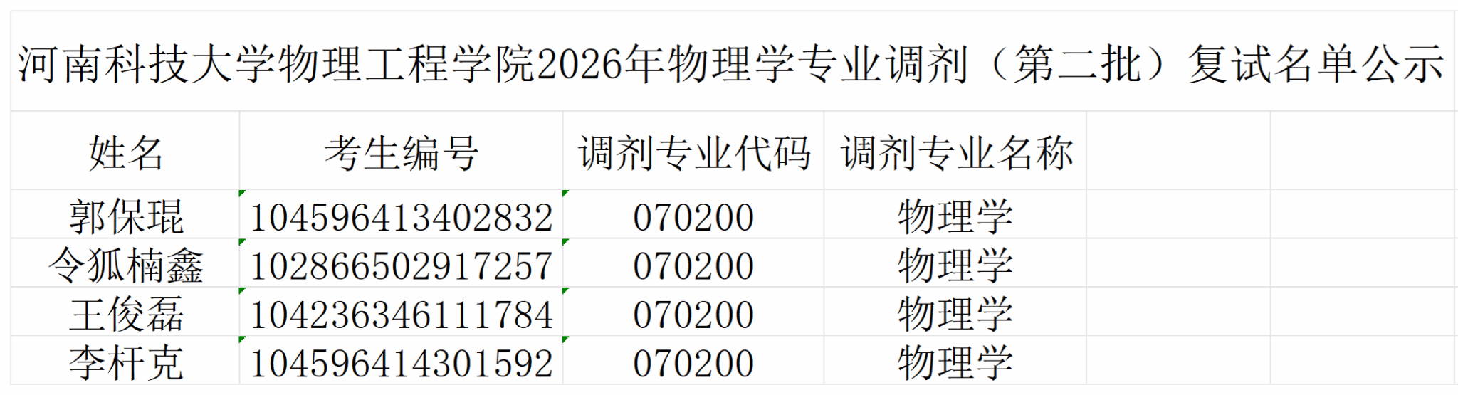 河南科技大学物理工程学院2026年物理学专业调剂(第二批)复试名单公示