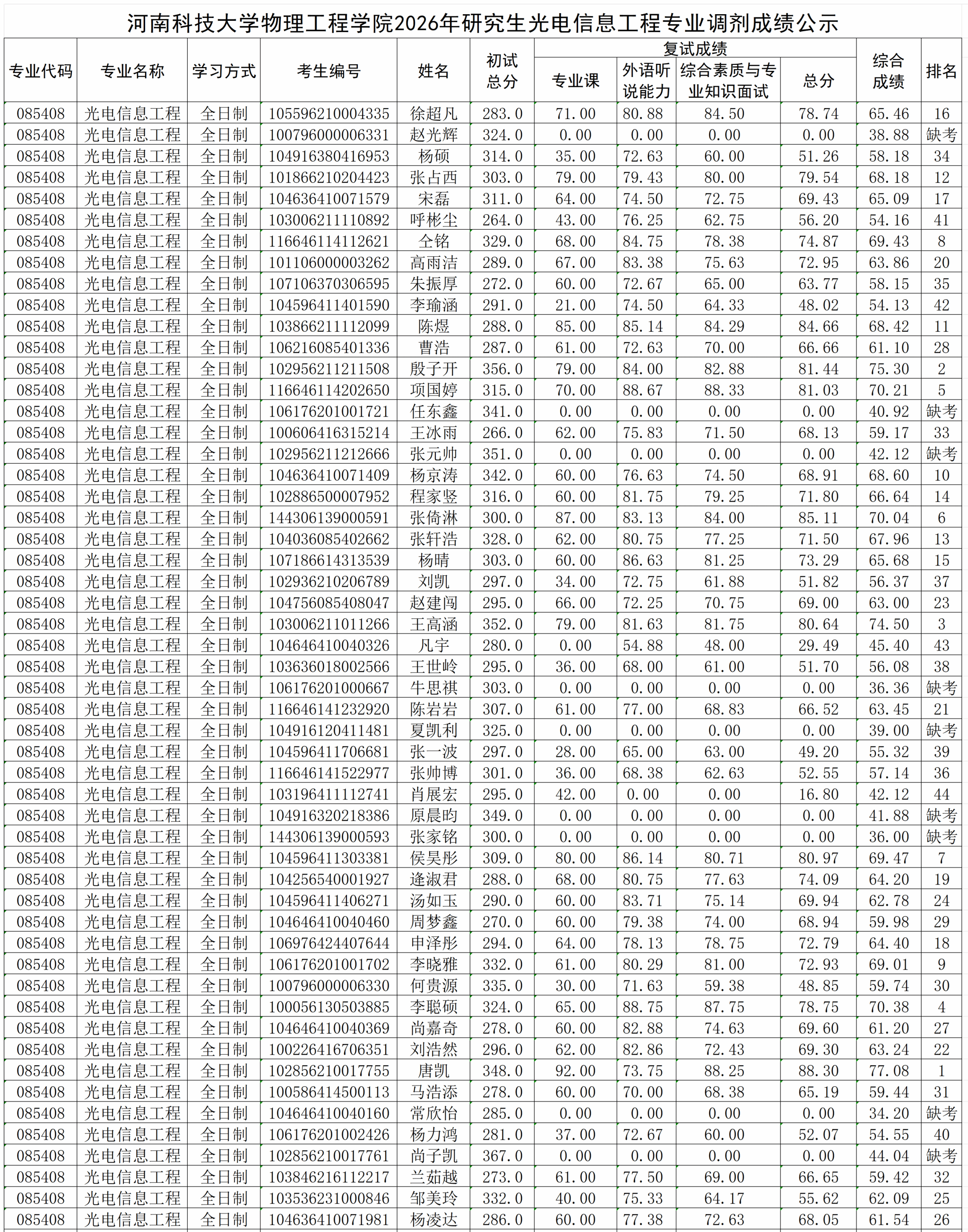 河南科技大学物理工程学院2026年研究生光电信息工程专业调剂成绩公示